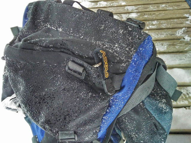 So as I left my lunch spot it indeed (as predicted) started drizzeling on me ... you know, that annoying tiny stuff that just wets you after an hour or so in it. I wasn't getting "wet" without my Goretex coat on so I just stayed with the fleece (which is a little water repellent) but my pack got a nice layer of ice on it.